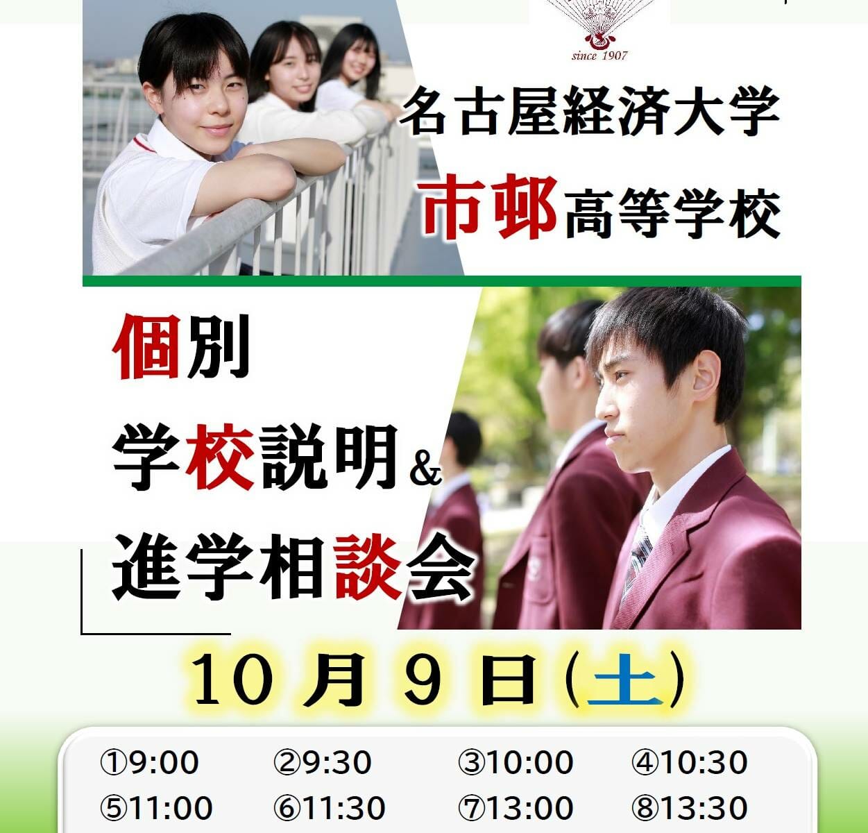 高校 個別学校説明&進学相談会10/9(土) 10月9日(土)高校 個別学校説明&進学相談会を行います。「来校」と「オンライン面談」から参加形態が選択可能!①~⑫の各時間帯それぞれ9組限定です。市邨高校への受験を検討している皆さま、是非ご参加ください! 高校の教育活動紹介MovieをUP!まずはこちらをご覧ください! 高校 教育活動紹介Movie | 学校法人市邨学園 名古屋経済大学市邨中学校 市邨高等学校 (ichimura.ed.jp) お申し込みは下のボタンから!※9月15日(水)16:00受付スタート!