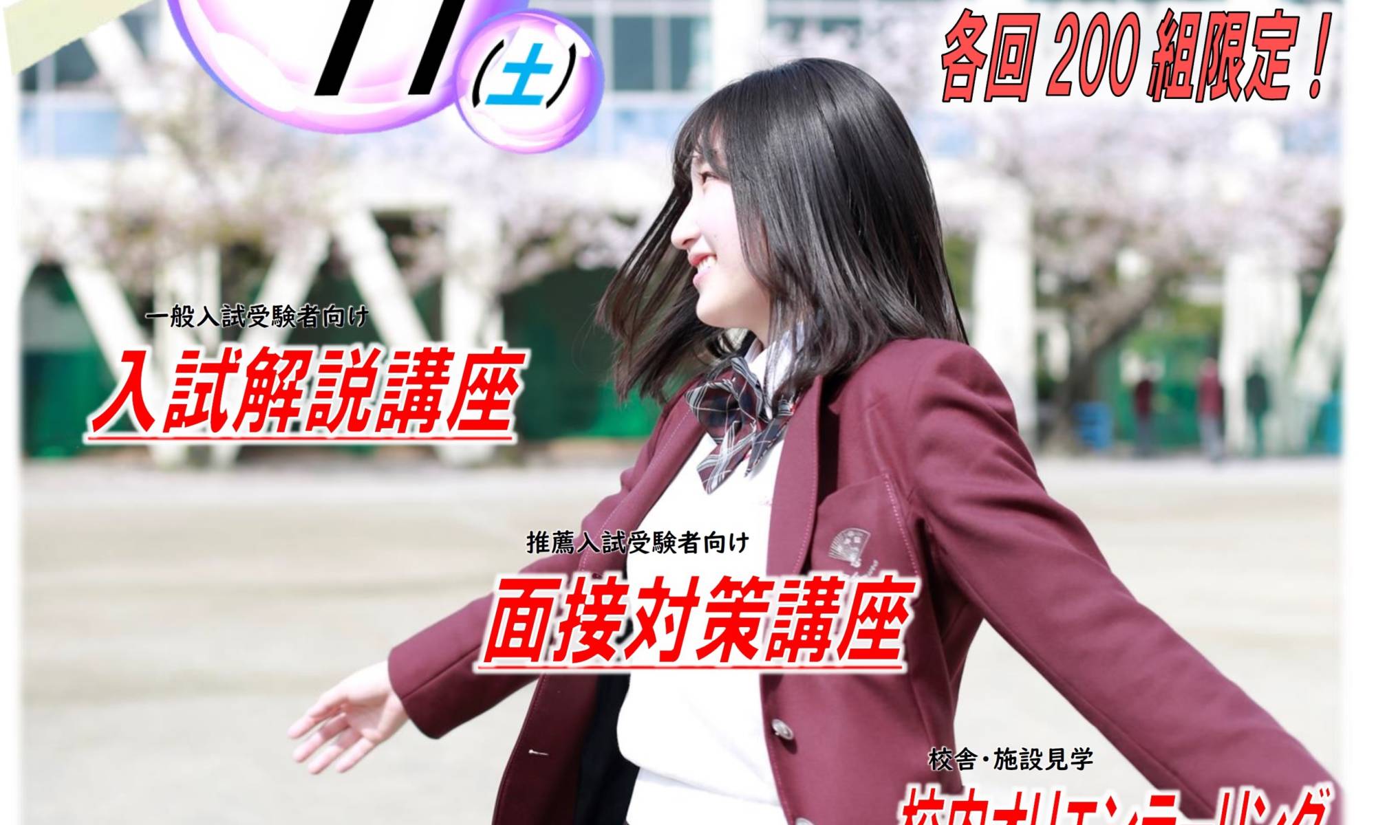 入試・入学説明会12/11(土) 午後の部 申し込み 実施概要はこちら 申込期限を12月9日(木)12:00まで延長します! 午後の部:13:30~16:00 実施概要はこちら 申込期限を12月9日(木)12:00まで延長します!