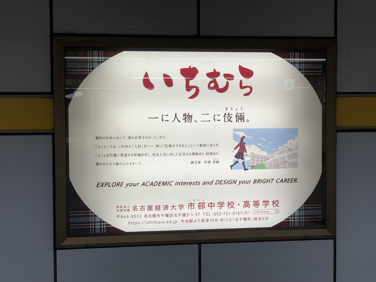 普段、市邨生がもっともよく利用している名古屋市営地下鉄「今池駅」のホームにある本校の看板が、今月リニューアルしました。