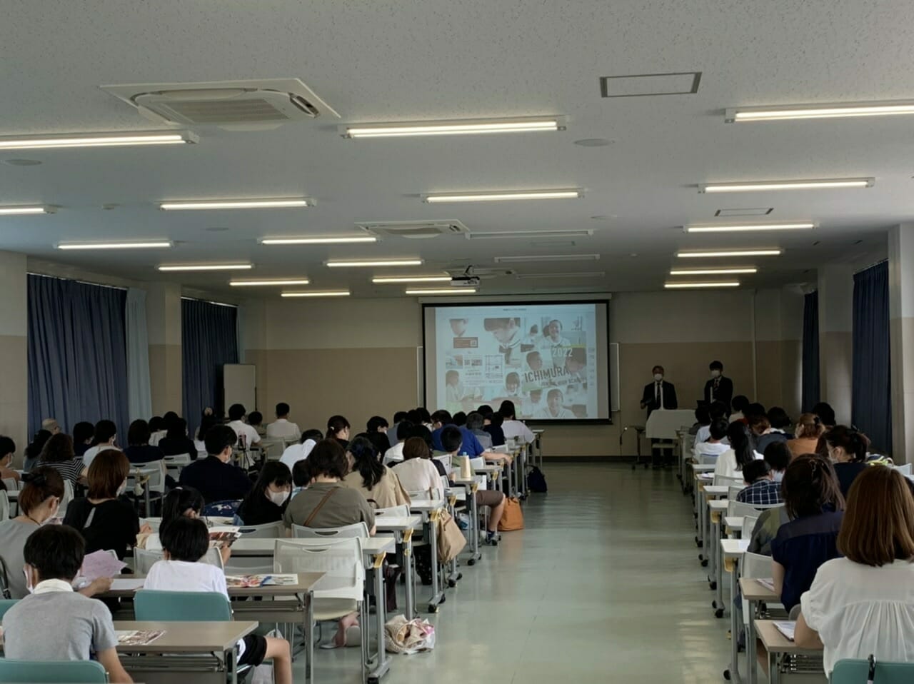 7月10日(土)、令和三年度第1回中学校見学会が行われました。今年度最初の中学校見学会ということで、大変多くの方にお越しいただきました。校内で最も広い大教室が満席になり、本校の注目度の高さをうかがい知ることができました。とはいえ、テーブルごとに最大限にスペースを取り、消毒液の設置や体調アンケートの実施、窓も開放して換気を徹底し、各種コロナ対策をしての実施となりました。