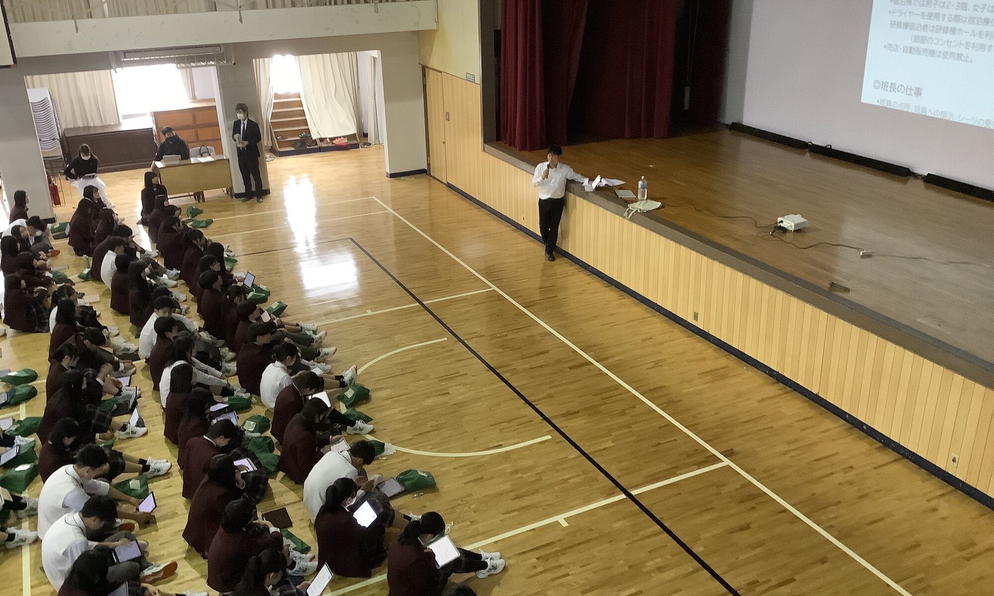 高1のブライドコース8クラス・キャリアデザインコース4クラスは、岐阜県高山市にある国立乗鞍青少年の家に出かけてオリエンテーション合宿を実施します。それに先立ち、直前ミーティングを本校講堂で実施しました。