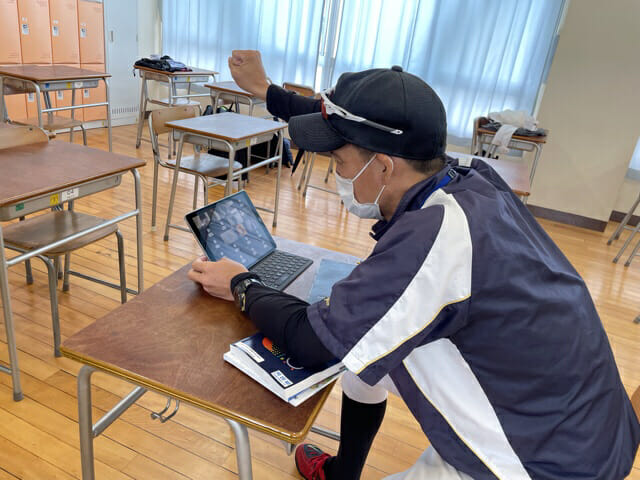 担任の先生からは「ストレッチはこまめに」と実感を込めた言葉がありました。その後は生徒は配信された課題に取り組みました。新鮮なオンライン体育の授業、授業後の感想からは生徒の満足度が見てとれました。