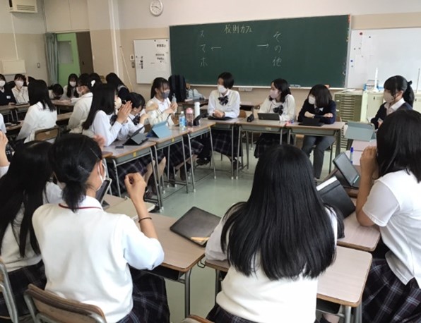 不満を言うのでなく「メイクのルール作りをして認めたらいいのではないか。」「第一ボタンが開けられないのは、下を向いた時やカバンを背負ったときに首が痛くて苦しい。」など、提案や理由付けがなされた意見が出されます。自ら考えて行動するという、市邨の大切にする「主体性」を象徴するものです。