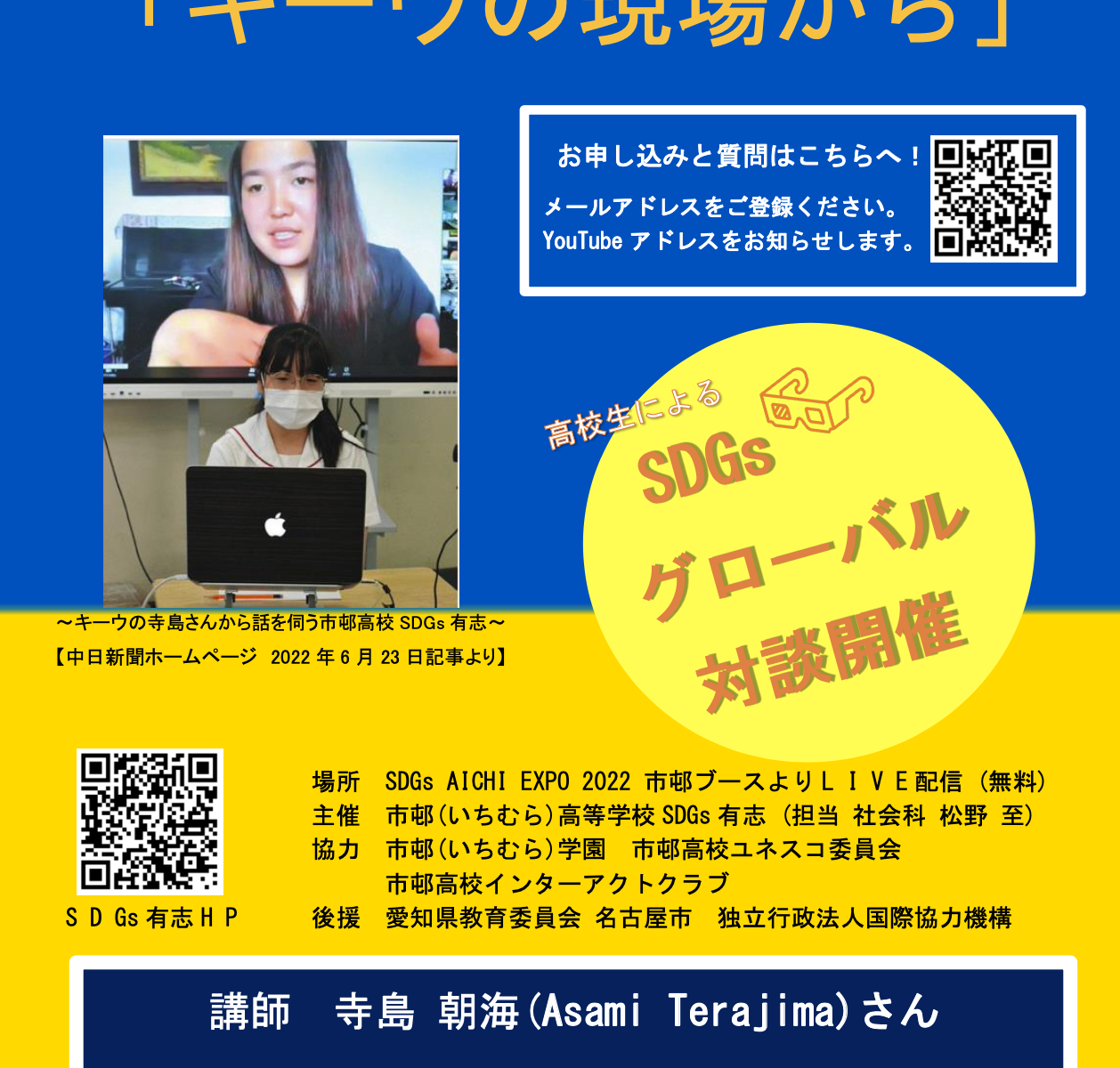 本校のSDGs有志は、国際問題について学び、考え、学んでいます。この活動には、現場で活躍されている方々の声がとても重要となってきます。これまで、地域の皆様、社会の皆様から学ばせていただき、取り組んできました。