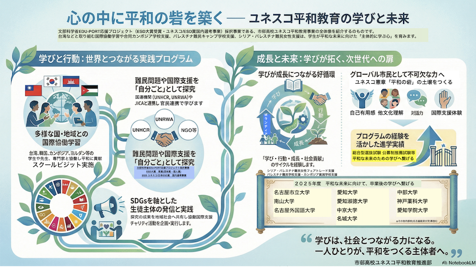 世界各地で紛争や分断が続く中、教育の役割はますます重要になっています。本校では今後も、ユネスコスクールとしての使命を大切にしながら、対話と協働を基盤としたESD・平和教育を継続し、持続可能で公正な社会の実現に向けた学びを、地域および世界とともに深めてまいります。