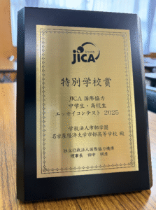 本事業は、これまでにJICAエッセイコンテスト機関長賞をはじめとする生徒個人の成果に加え、学校全体としての取り組みが評価され、今回のJICA特別学校賞の受賞につながりました。