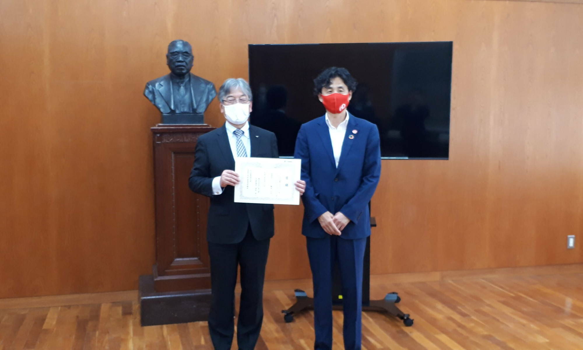 写真は、日の宮工業代表取締役・澤村信一様より、本校澁谷有人校長に目録が贈呈された際の様子です。