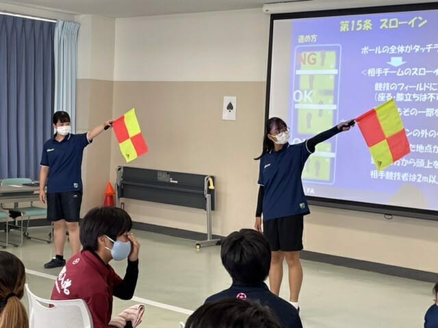 実技と映像を交えて、正しいスローイン、ファウル、オフサイドそして副審のシグナル。