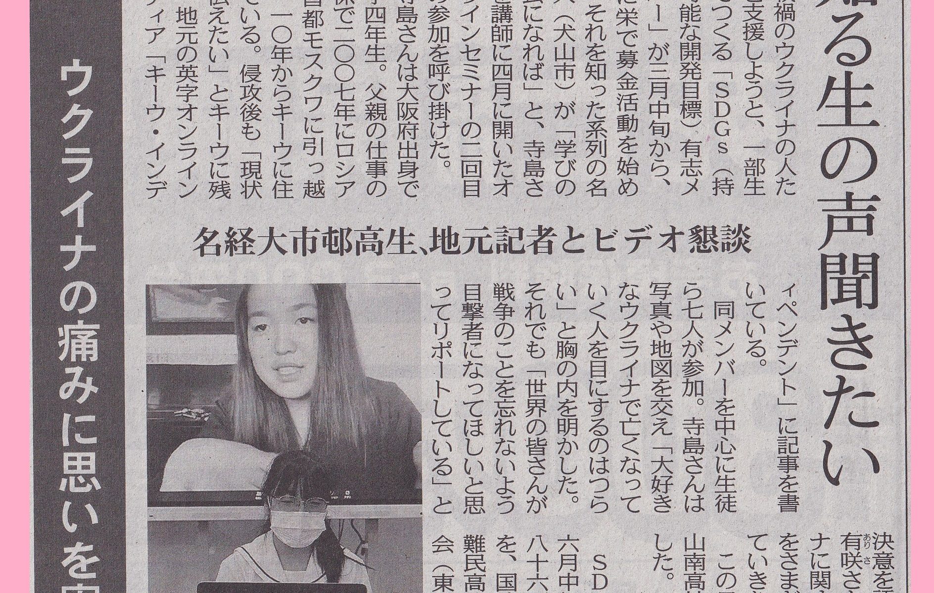 高校・SDGs有志ボランティアの生徒たちが、在キーウの日本人記者とリモート会談を行い、インタビューや質疑応答などを犬山南高校の生徒たちとともに行った際の模様が、2022年6月23日(木) 中日新聞・朝刊21面(市民版)に掲載されました。
