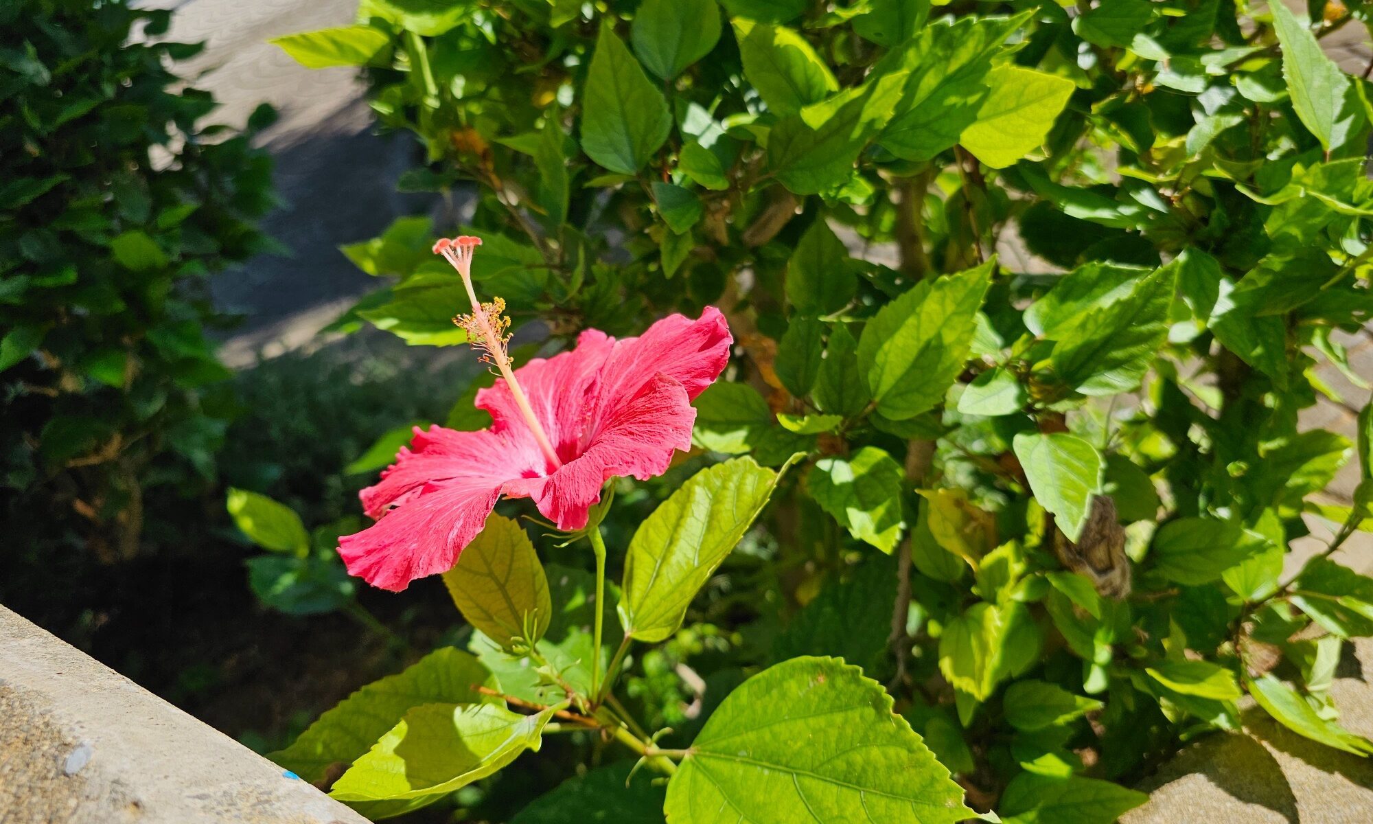 道端に咲くハイビスカスの花を男子生徒が見つけ、彼が写真を撮りました。