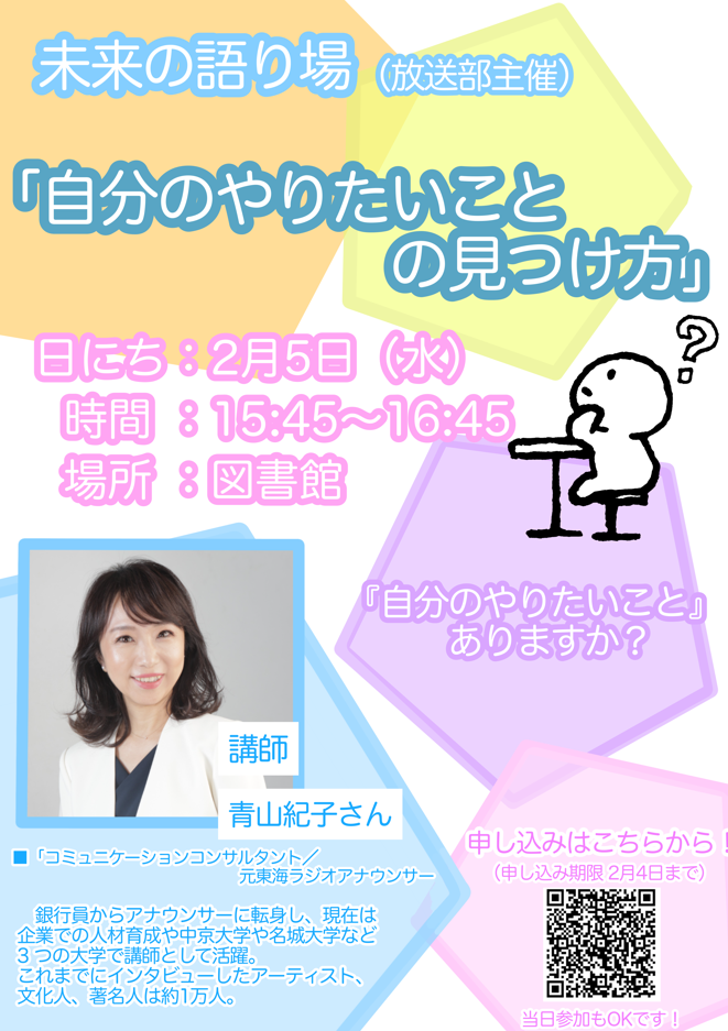 2月5日(水)の放課後,元・東海ラジオアナウンサーで,現在はフリーアナウンサー,コミュニケーションコンサルタント,大学非常勤講師としてご活躍されている青山紀子さんを講師にお招きし,「未来の語り場」を開催しました。今回は放送部が主催です。