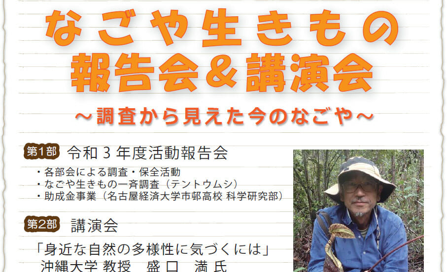 5月8日(日)に名古屋市立大学桜山キャンパス・さくら講堂にて、なごや生物多様性保全活動協議会の活動報告会『なごや生きもの報告会&講演会~調査から見えた今のなごや~』が開催されます。