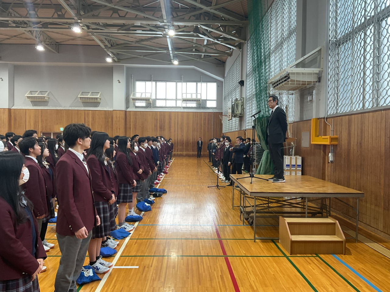 校歌斉唱の後、校長先生からは年始のあいさつとお話がありました。「自分自身の成長のために、挑戦をし続けよう、自ら一歩踏み出そう」以前から若山校長先生がたびたび生徒たちに投げかけているこの言葉の先には、新たな挑戦には失敗はつきもの。失敗しても、むしろそれは「ナイスチャレンジ」で、自ら一歩踏み出した証拠でもある。成功体験とは、「自分から一歩踏み出して行動したこと」それ自体であって、その経験そのものが成長の糧になり、人生における財産にもなる、といった内容でした。