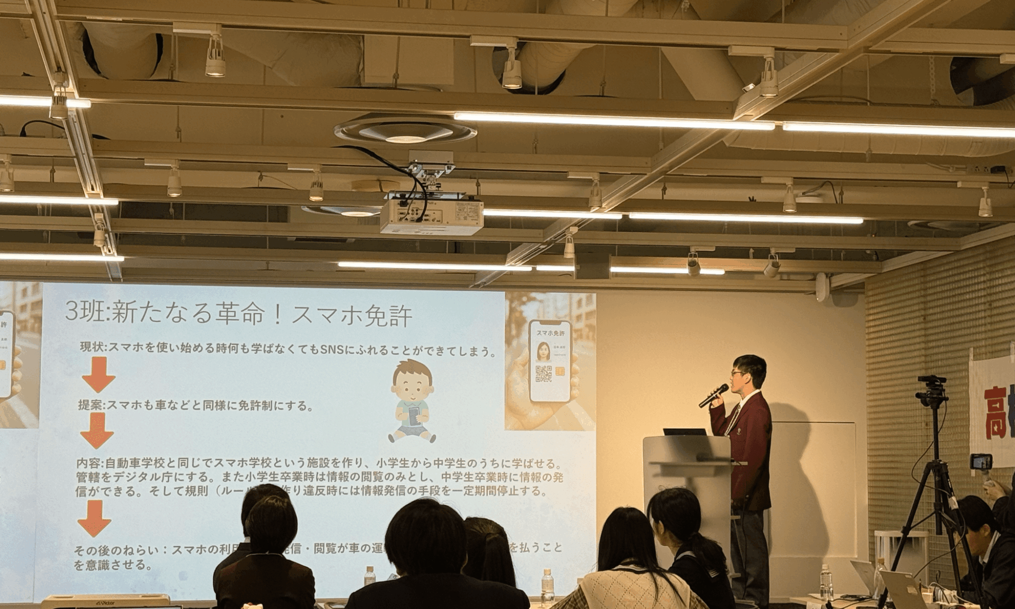 パートナー協定を結ぶ学校と一緒に取り組む活動を他校生徒に報告しています。