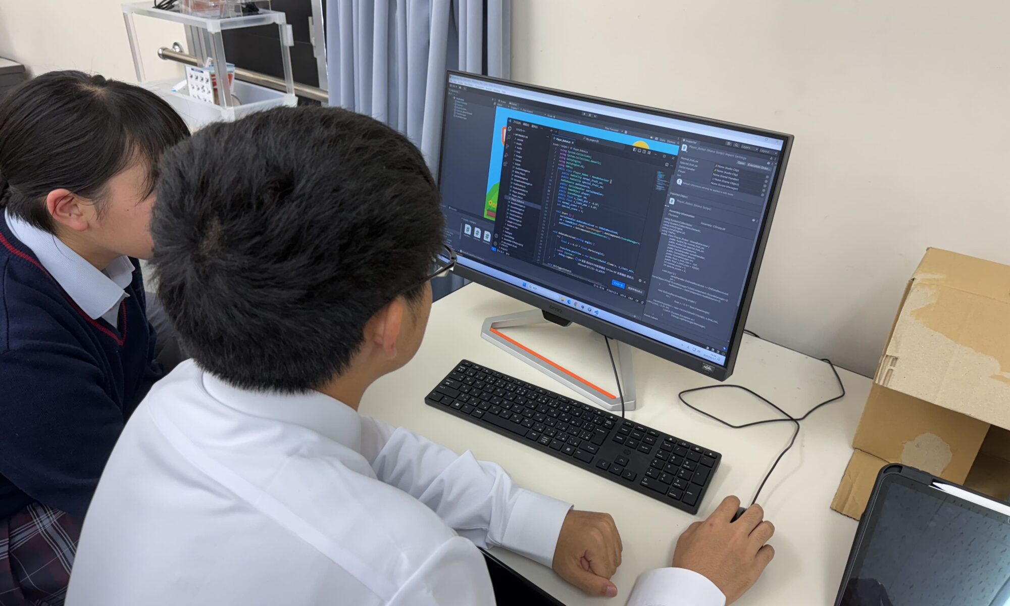 Unityを動かすのはもちろん、小型コンピューターに傾きを完治するセンサーを取り付けてプログラミングを行い、コントローラーを制作したり、ガレージバンドを用いてゲーム内BGMを作成したり、役割が多岐に渡りますが、生徒はしっかりとチームで取り組みます。