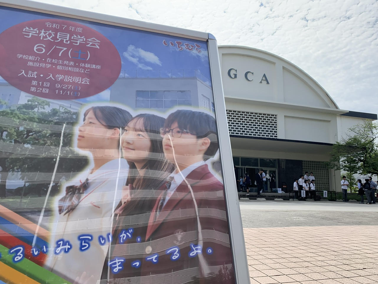 6月7日(土)、市邨中学校では、令和7年度 学校見学会が行われました。事前申込数が約170組と、本校の講堂がいっぱいになるほどの参加者を迎えることができました。入口では見学会ボランティアの在校生たちが元気よく出迎えていました。