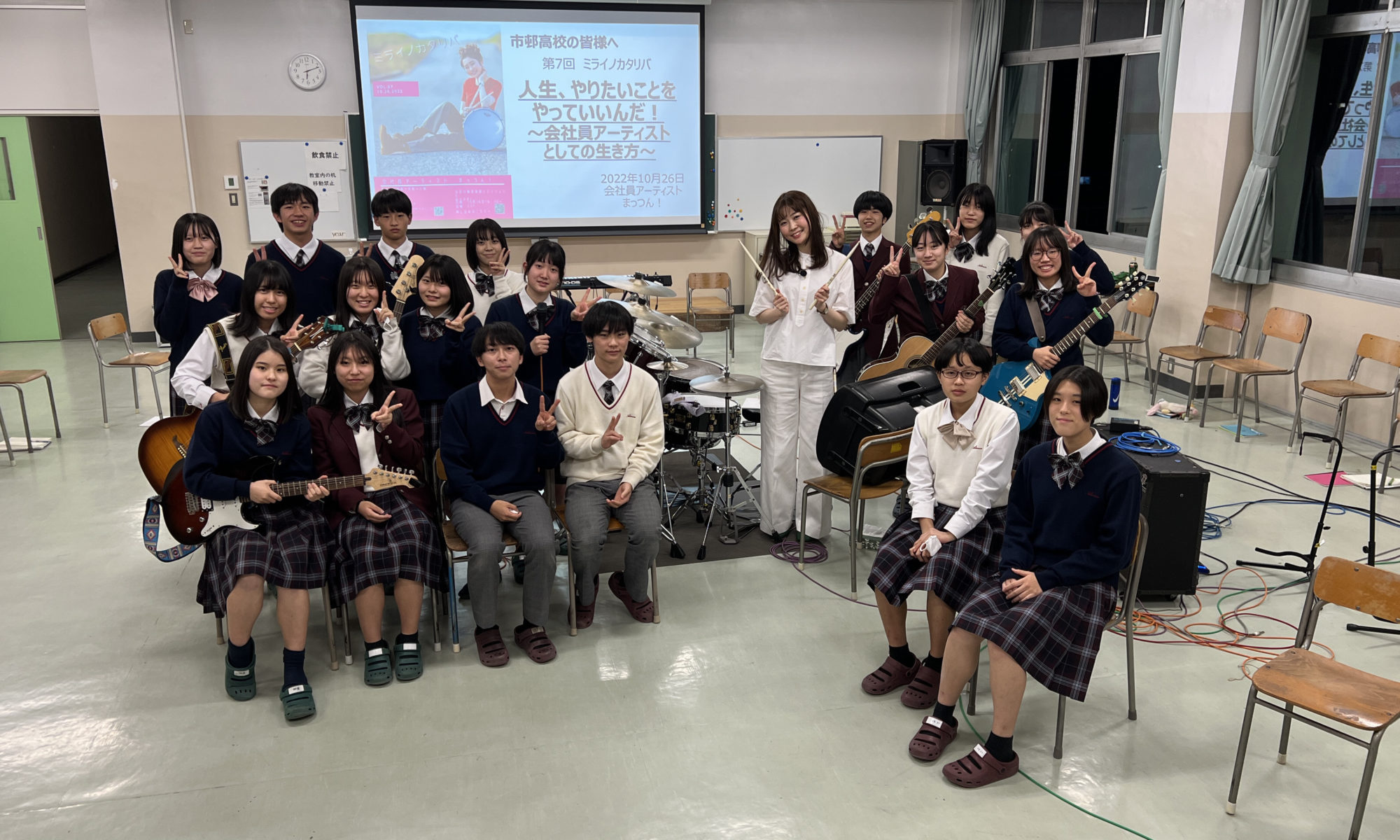 7回目を迎えた「ミライノカタリバ」(注;当イベントはNPO法人カタリバとは無関係です)、今回は会社員アーティストまっつん!さんをお迎えしました。約1時間で、会社員としてのお仕事も、アーティストとしての音楽活動も、またモデルとしての活動も、楽しみつつまた誇りを持って並行されていらっしゃる様子をお聞きすることができました。ともすると、好きなことと仕事の両立については、二の足を踏んだり、「簡単じゃないよ」と思いとどまるよう話してしまいそうですが、まっつん!さんから、楽しみながらご自分で選択していく軽やかさとそこから広がる可能性についてポジティブにお話しいただき、高校生はもとより教員にとっても刺激的で学びの深い時間になりました。やりたい仕事に打ち込み、帰宅後にスタジオで数時間練習をし、週末には複数のレッスンに通うという生活はとてもハードに聞こえますが、自分で選び取っているからこそ、充実の日々であることが伝わってきました。とはいえ、まっつん!さんご自身も最初からそのような姿勢になれたわけではなく、コンプレックスとの戦いもあったとのこと。さまざまな軌跡を描いての今があることもよくわかりました。当日は軽音部の生徒たちも参加し、セッションを行ってくれました。全国大会へ出場する本校の軽音部ですが、部員の皆さんも、自分の生き方の参考になったことはたくさんあったことでしょう。