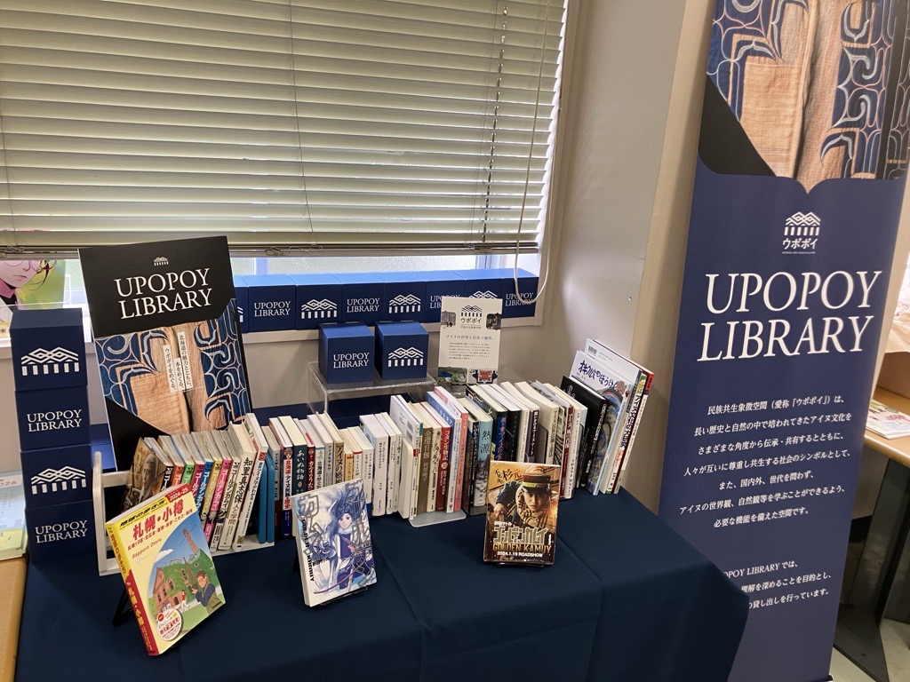 高校校舎の自主学習室に、UPOPOY LIBRARY(ウポポイ・ライブラリ)のブースが出現しました。北海道白老郡にある民族共生象徴空間【ウポポイ】のプロモーションとともに、修学旅行の事前学習に役立ててほしいとの思いで設置されました。