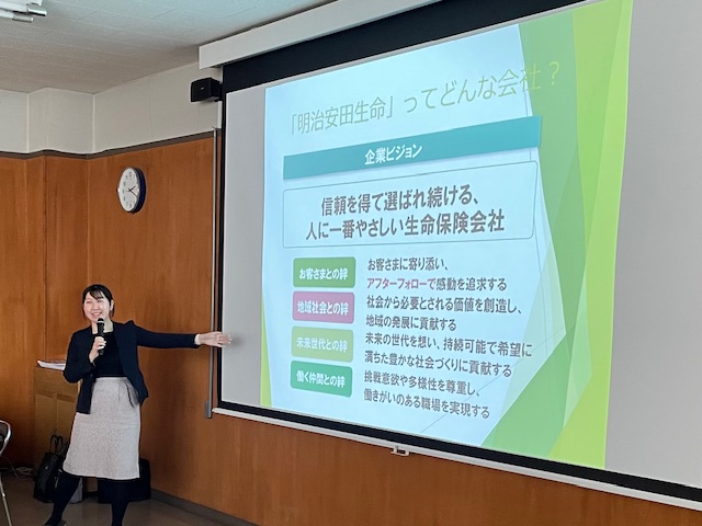 まずは生徒の質問に答えつつ自己紹介をしていただきました。「この仕事を目指すことになったきっかけ」、「現在の仕事内容」、「どのように投資をしているか」など具体的な話をしていただきました。さらに明治安田生命が取り組む様々な事業をご紹介いただきました。
