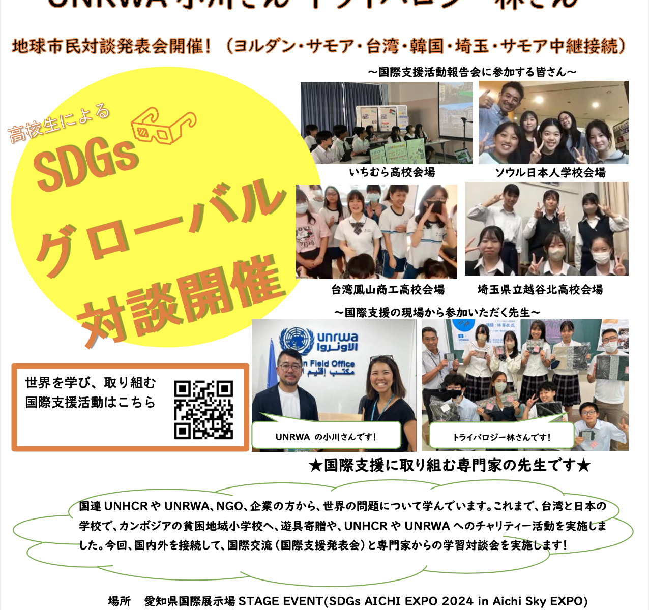 SDGs EXPO AICHI 2024のステージと関係国(専門家と学生)をオンラインで繋ぎ、難民支援貧困支援報告会、対談会を行いました。