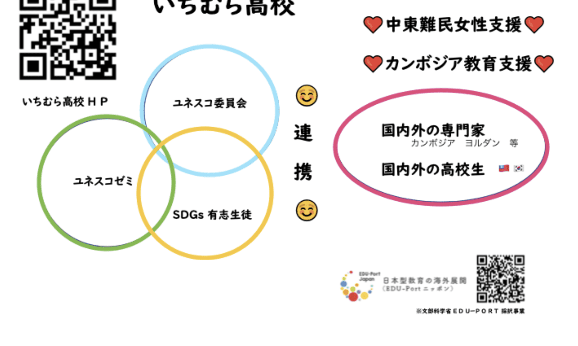 これまでに、カンボジアの学校環境改善、パレスチナの子どもたちへの学習支援、フェアトレードを通じた難民女性の自立支援などを、台湾と日本の高校生が協力して実現しています。こうした実践は、国境を越えた対話と協働を通じて「平和の文化」を築く取り組みであり、ユネスコスクールとしての ESD 教育の大切な一環となっています。