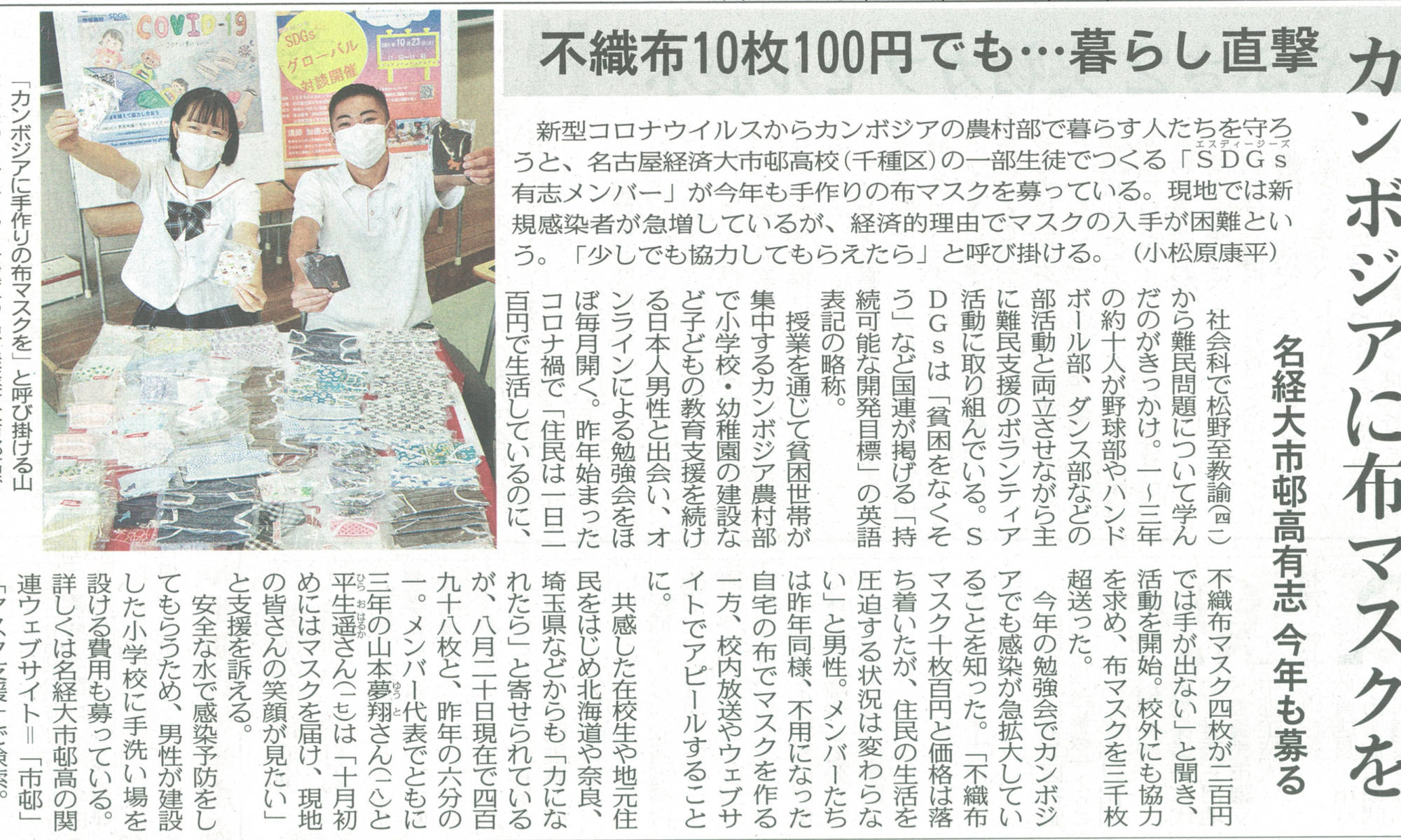 SDGs有志ボランティアメンバーが取り組むカンボジアへのマスク支援が中日新聞の取材を受け、その様子が紙面に掲載されました!
